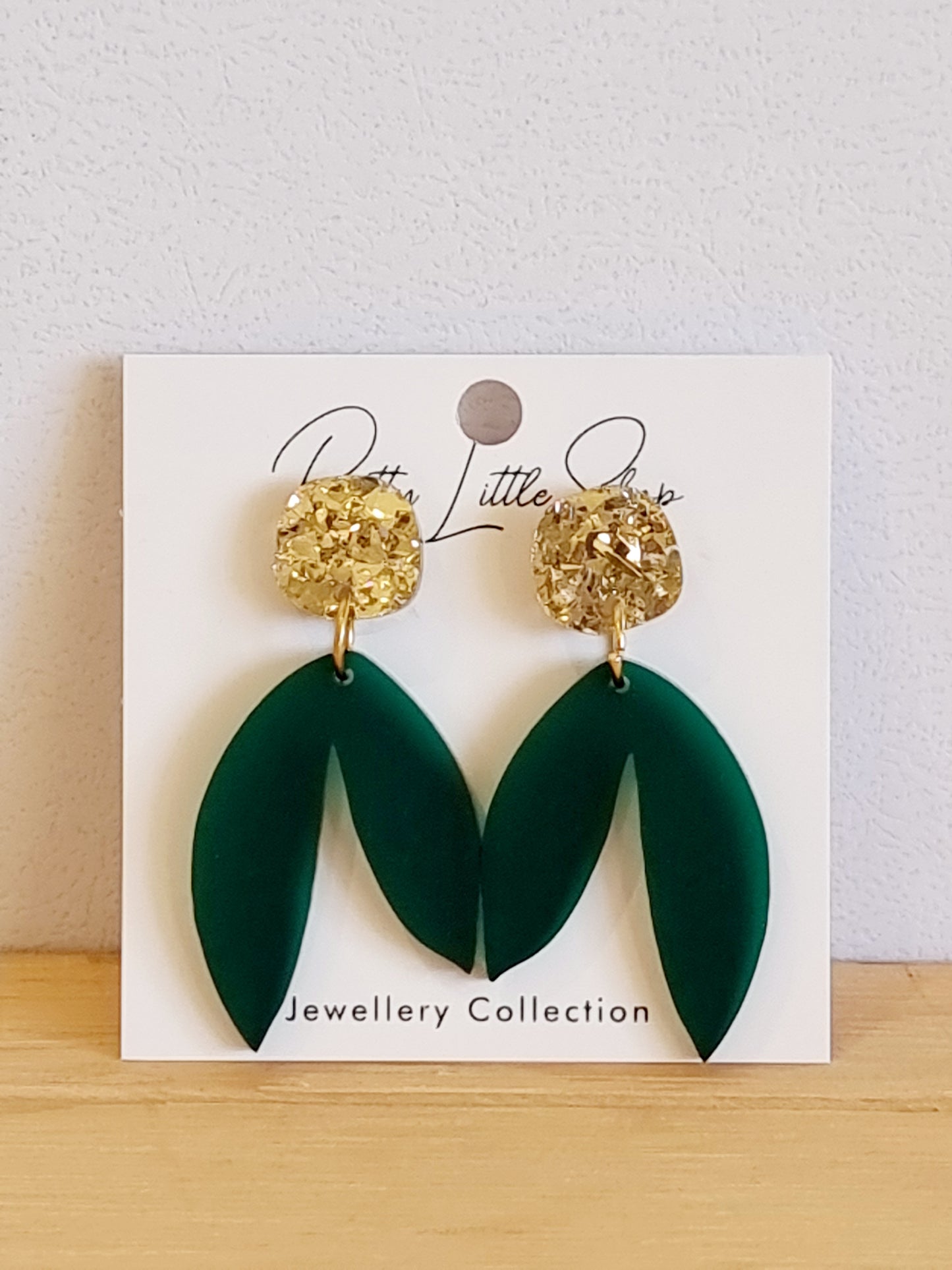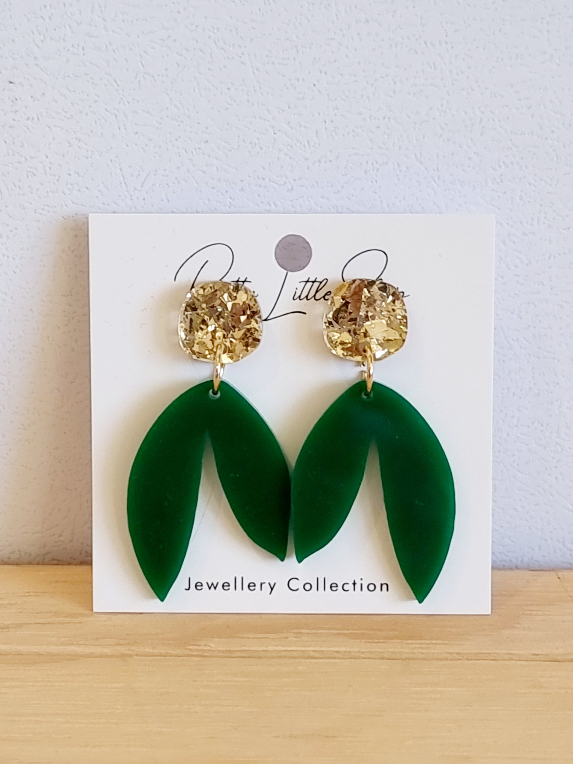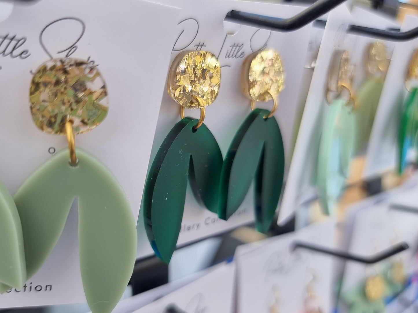 A stylish, elegant and fun pair of earrings right here ! Dress up or dress down either way these little beauties will go with any outfit you choose ! Different shades of green with gold crystal look topper.